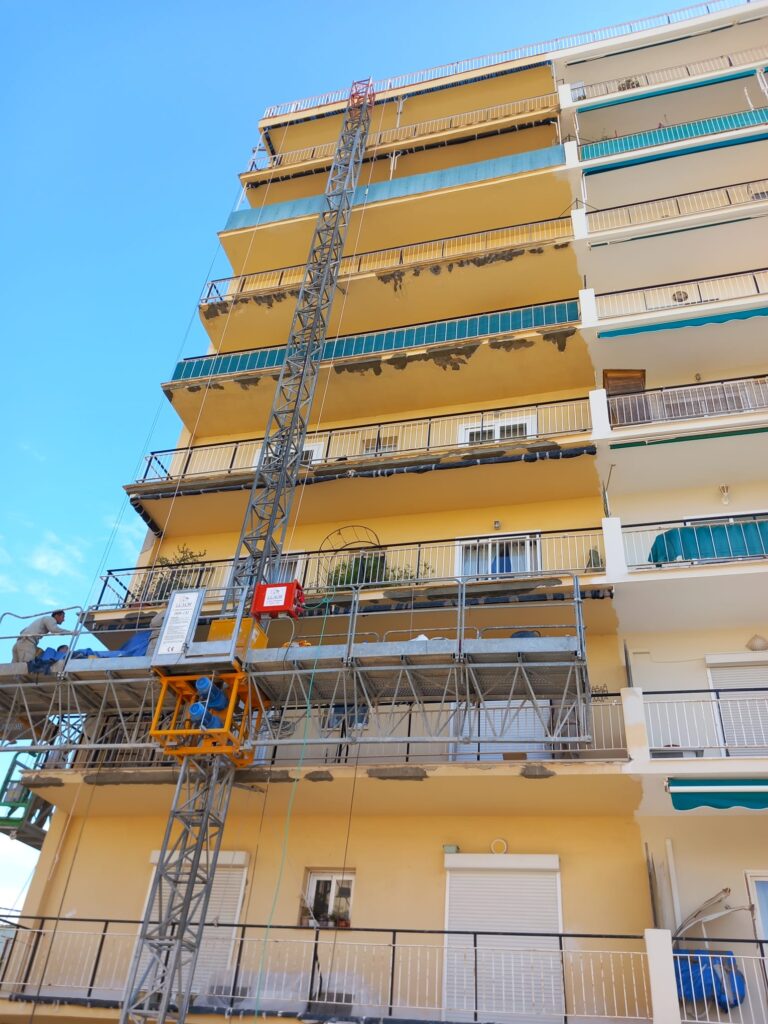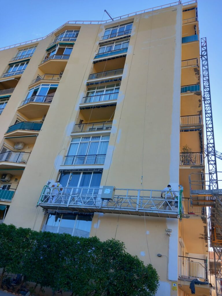 En una rehabilitación de este tipo, la seguridad es primordial. Instalamos andamios colgantes eléctricos que permitieron trabajar con seguridad y eficacia en toda la fachada, minimizando las molestias a los vecinos. Además, el proyecto contempló un plan de recogida y gestión de escombros, así como el transporte a vertedero autorizado.